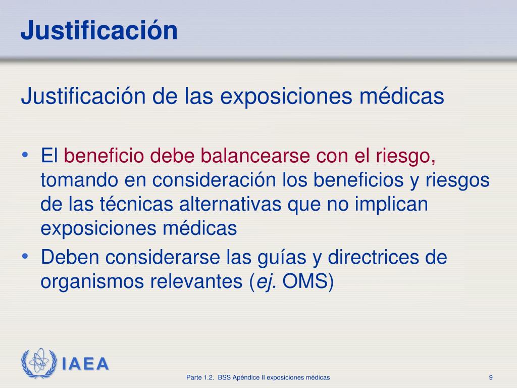 Justificación • Justificación de las exposiciones médicas • Elbeneficio debe balancearse con el riesgo,tomando en consideración los beneficios y riesgos de las técnicas alternativas que no implican exposiciones médicas • Deben considerarse las guías y directrices de organismos relevantes (ej. OMS)