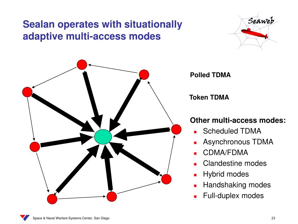 Other multi-access modes: Scheduled TDMA Asynchronous TDMA CDMA/FDMA Clandestine modes Hybrid modes Handshaking modes Full-duplex modes Sealan operates with situationally adaptive multi-access modes • Polled TDMA • Token TDMA Space & Naval Warfare Systems Center, San Diego