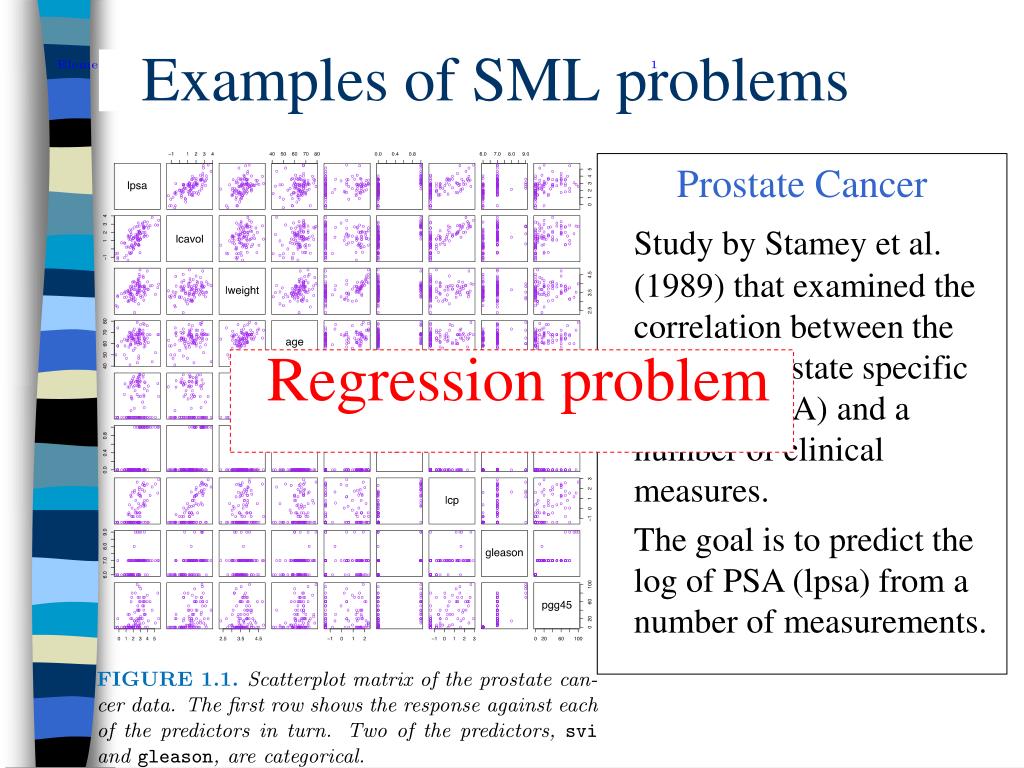 Examplesof SML problems ProstateCancer StudybyStameyet al. (1989) thatexaminedthecorrelationbetweenthelevelofprostatespecificantigen (PSA) and a numberofclinicalmeasures. Thegoal is to predictthelogof PSA (lpsa) from a numberofmeasurements. • Regressionproblem