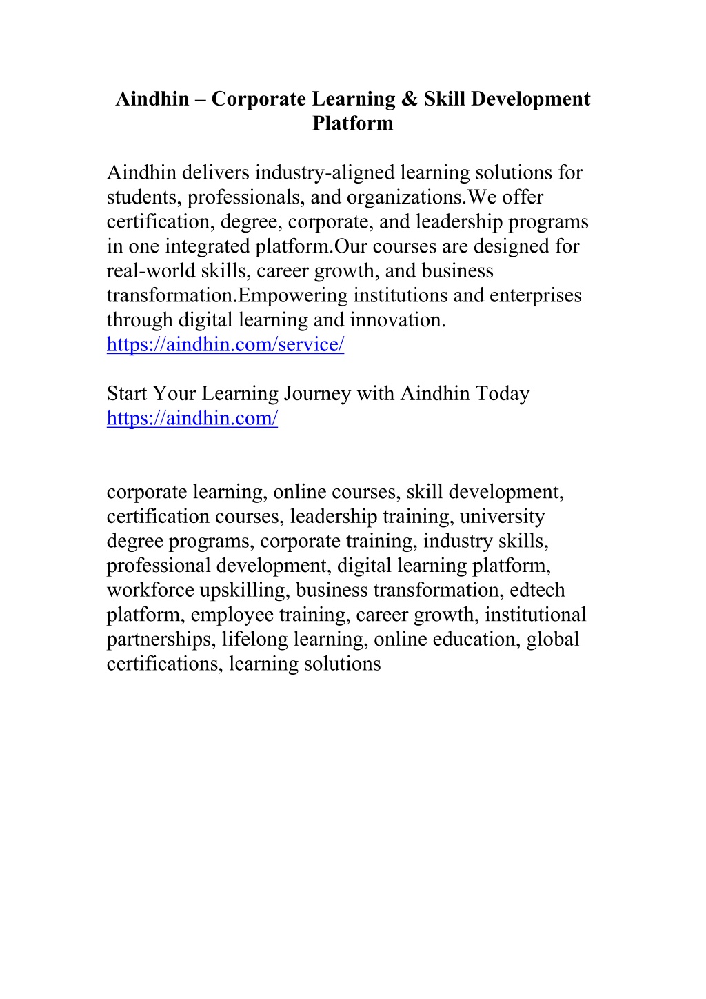 Aindhin delivers industry-aligned learning solutions for students, professionals, and organizations.We offer certification, degree, corporate, and leadership programs in one integrated platform.Our courses are designed for real-world skills, career growth, and business transformation.Empowering institutions and enterprises through digital learning and innovation. https://aindhin.com/service/<br><br>Start Your Learning Journey with Aindhin Today https://aindhin.com/<br><br><br>corporate learning, online courses, skill development, certification courses, leadership training, university degree programs, corpora