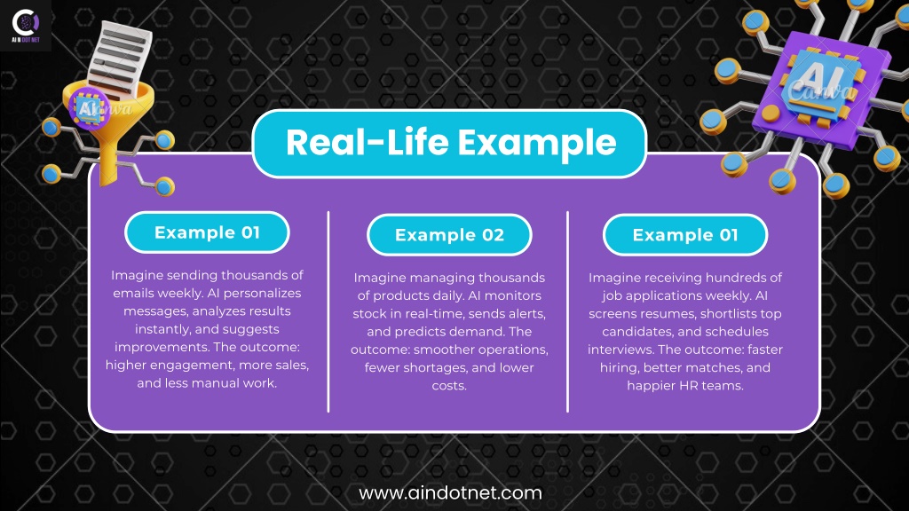 Real-Life Example Example 01 Example 02 Example 01 Imagine sending thousands of emails weekly. AI personalizes messages, analyzes results instantly, and suggests improvements. The outcome: higher engagement, more sales, and less manual work. Imagine managing thousands of products daily. AI monitors stock in real-time, sends alerts, and predicts demand. The outcome: smoother operations, fewer shortages, and lower costs. Imagine receiving hundreds of job applications weekly. AI screens resumes, shortlists top candidates, and schedules interviews. The outcome: faster hiring, better matches, and happier HR teams. www.aindotnet.com www.aindotnet.com