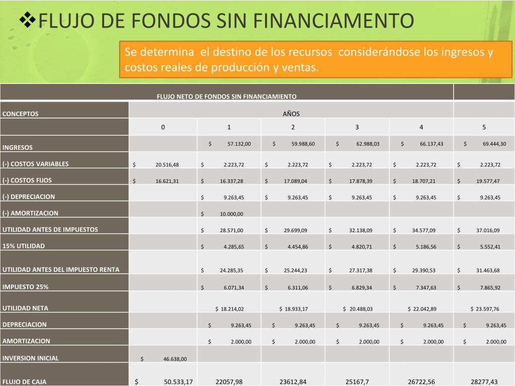 Se determina el destino de los recursos considerándose los ingresos y costos reales de producción y ventas. • FLUJO DE FONDOS SIN FINANCIAMENTO