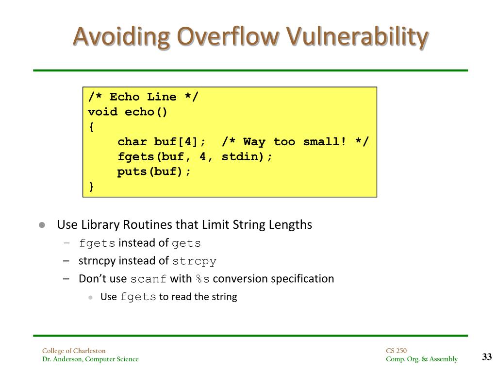 Avoiding Overflow Vulnerability • Use Library Routines that Limit String Lengths • fgets instead of gets • strncpy instead of strcpy • Don’t use scanf with %s conversion specification • Use fgets to read the string /* Echo Line */void echo(){ char buf[4]; /* Way too small! */ fgets(buf, 4, stdin); puts(buf);}