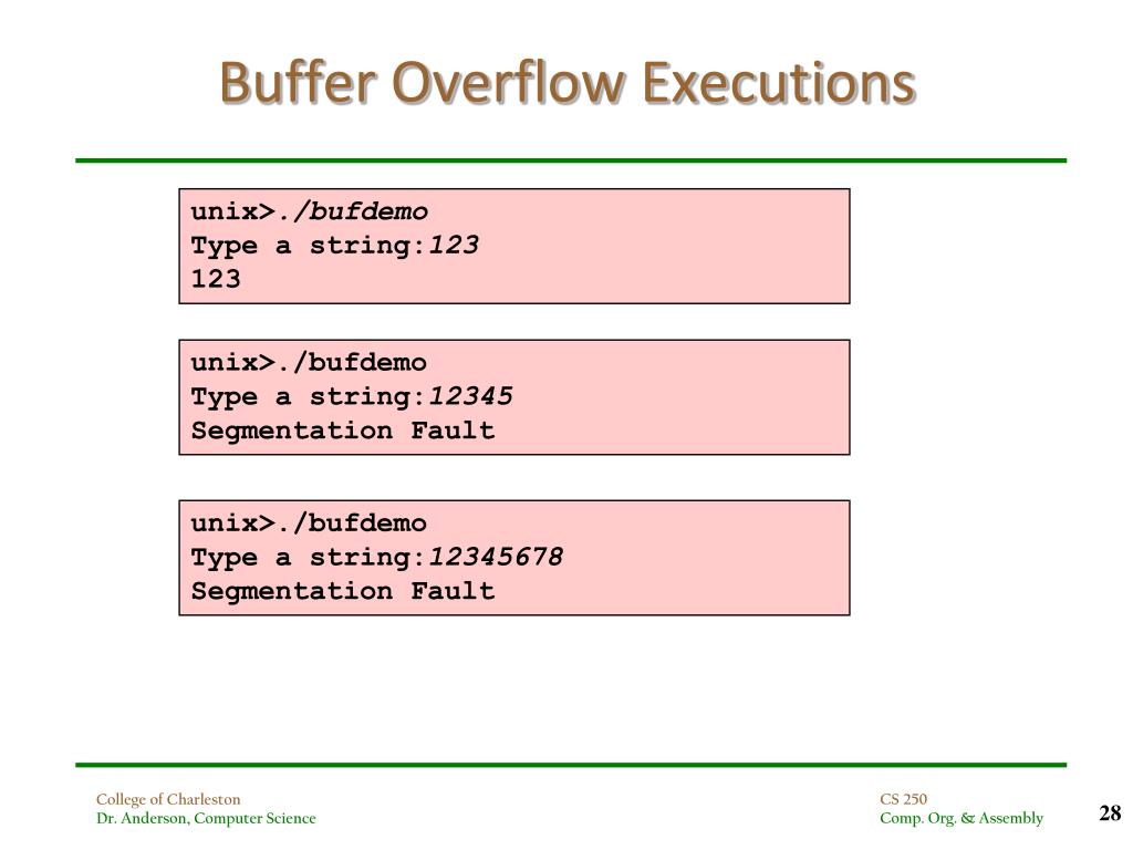 Buffer Overflow Executions unix>./bufdemo Type a string:123 123 unix>./bufdemo Type a string:12345 Segmentation Fault unix>./bufdemo Type a string:12345678 Segmentation Fault