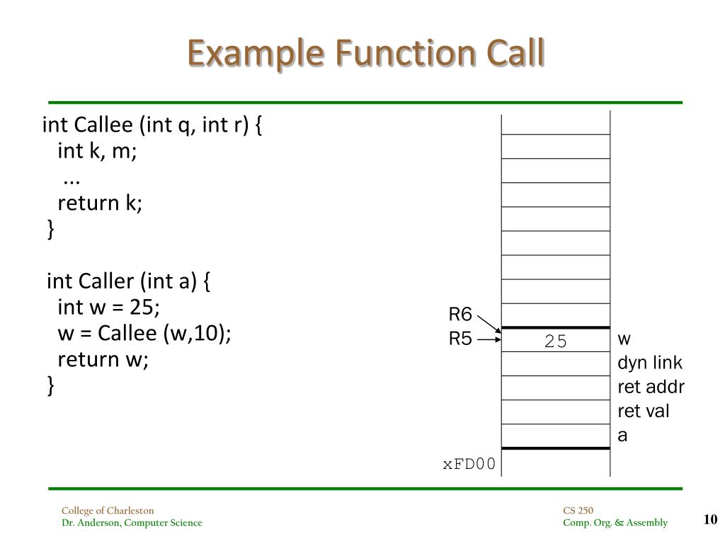 Example Function Call int Callee (int q, int r) { int k, m; ... return k;}int Caller (int a) { int w = 25; w = Callee (w,10); return w;} w dyn link ret addr ret val a 25 R6 R5 xFD00