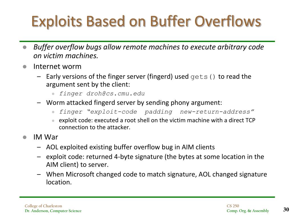 Exploits Based on Buffer Overflows • Buffer overflow bugs allow remote machines to execute arbitrary code on victim machines. • Internet worm • Early versions of the finger server (fingerd) used gets() to read the argument sent by the client: • finger droh@cs.cmu.edu • Worm attacked fingerd server by sending phony argument: • finger “exploit-code padding new-return-address” • exploit code: executed a root shell on the victim machine with a direct TCP connection to the attacker. • IM War • AOL exploited existing buffer overflow bug in AIM clients • exploit code: returned 4-byte signature (the bytes at some location in the AIM client) to server. • When Microsoft changed code to match signature, AOL changed signature location.