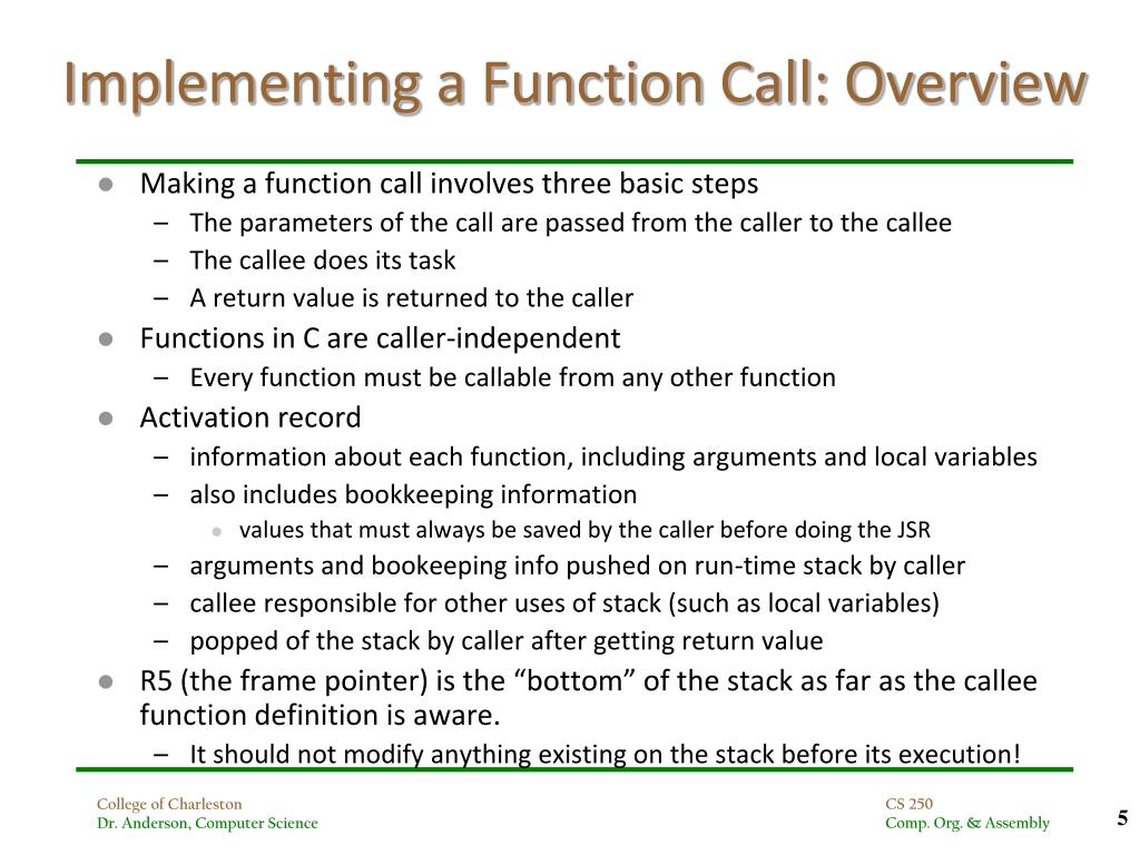 Implementing a Function Call: Overview • Making a function call involves three basic steps • The parameters of the call are passed from the caller to the callee • The callee does its task • A return value is returned to the caller • Functions in C are caller-independent • Every function must be callable from any other function • Activation record • information about each function, including arguments and local variables • also includes bookkeeping information • values that must always be saved by the caller before doing the JSR • arguments and bookeeping info pushed on run-time stack by caller • callee responsible for other uses of stack (such as local variables) • popped of the stack by caller after getting return value • R5 (the frame pointer) is the “bottom” of the stack as far as the callee function definition is aware. • It should not modify anything existing on the stack before its execution!