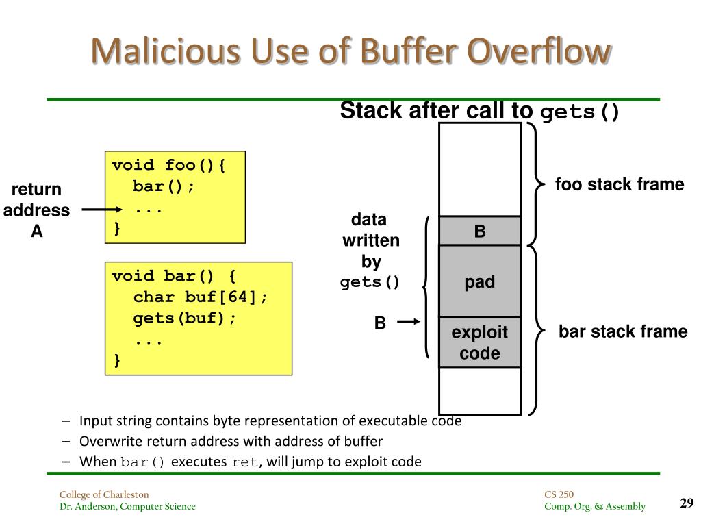Malicious Use of Buffer Overflow Stack after call to gets() • Input string contains byte representation of executable code • Overwrite return address with address of buffer • When bar() executes ret, will jump to exploit code void foo(){ bar(); ... } foo stack frame return address A data written by gets() B pad void bar() { char buf[64]; gets(buf); ... } B exploit code bar stack frame