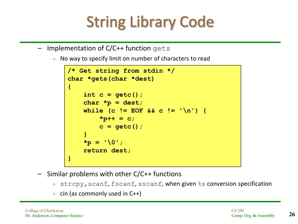 String Library Code • Implementation of C/C++ function gets • No way to specify limit on number of characters to read • Similar problems with other C/C++ functions • strcpy,scanf, fscanf, sscanf, when given %s conversion specification • cin (as commonly used in C++) /* Get string from stdin */ char *gets(char *dest){int c = getc(); char *p = dest; while (c != EOF && c != '\n') { *p++ = c; c = getc(); } *p = '\0'; return dest; }