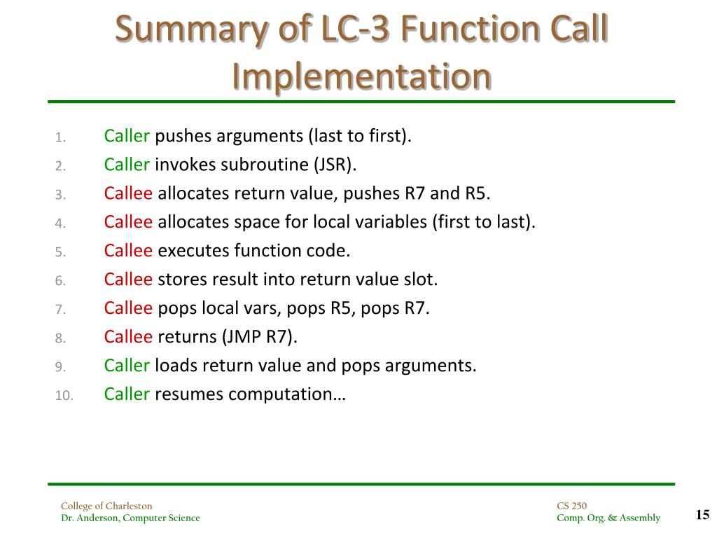 Resuming the Caller Function • w = Callee(w,10); • ; JSR Callee ; LAST COMMAND; load return value (top of stack)LDR R0, R6, #0; perform assignment of return valueSTR R0, R5, #0; pop return value and argumentsADD R6, R6, #3 … Continue caller code ret val q r w dyn link ret addr ret val a 217 25 10 217 R6 new R6 R5 xFD00