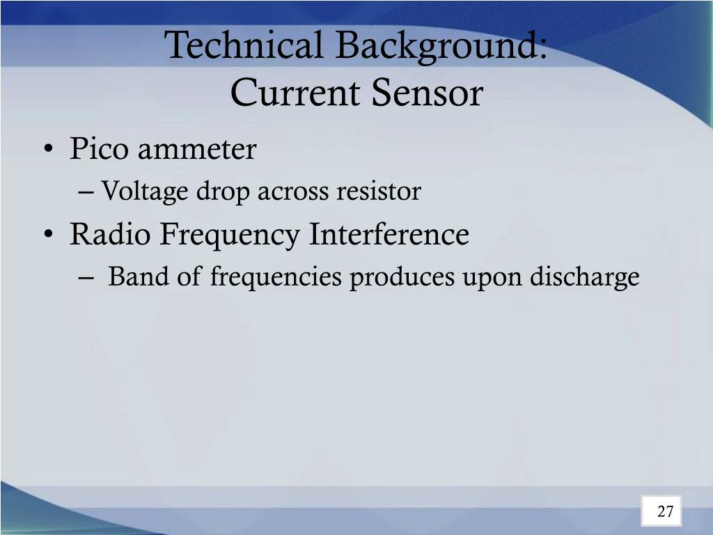 Technical Background:Current Sensor • Pico ammeter • Voltage drop across resistor • Radio Frequency Interference • Band of frequencies produces upon discharge