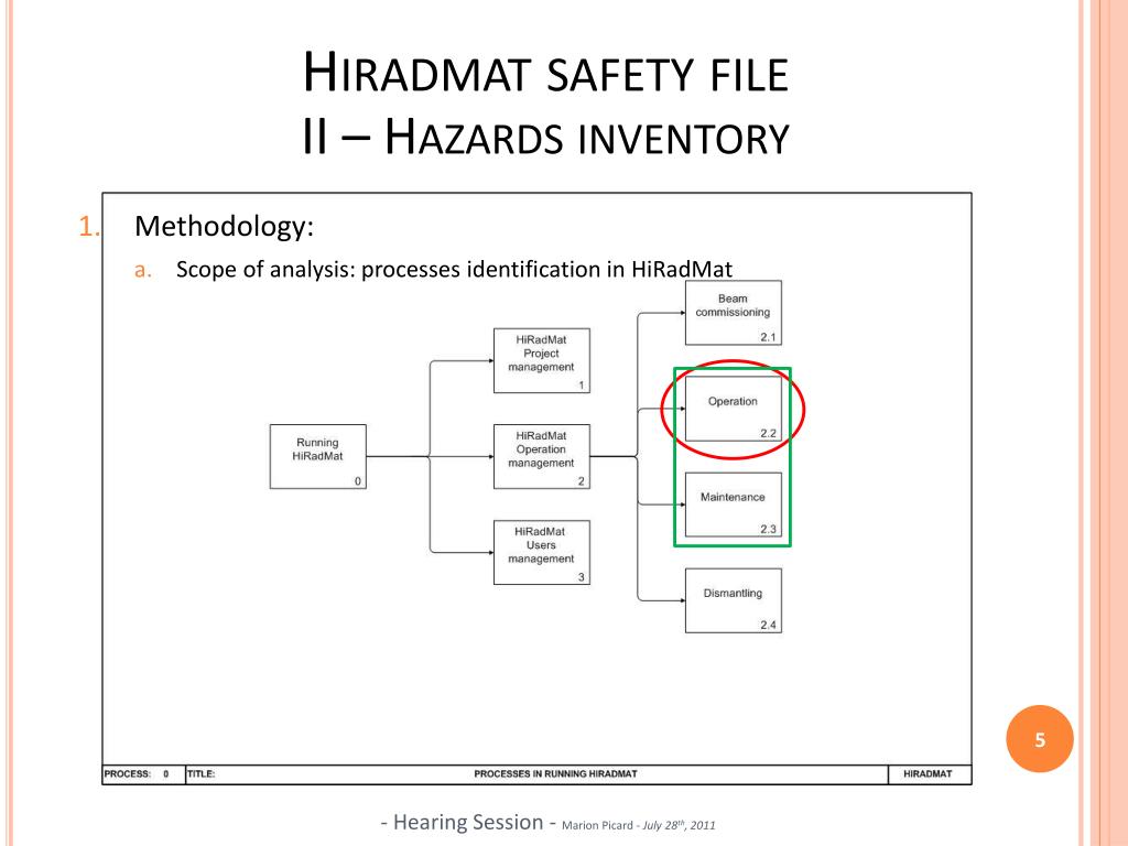 Hiradmatsafety fileII – Hazardsinventory • Methodology: • Scope of analysis: processes identification in HiRadMat - Hearing Session - Marion Picard - July 28th, 2011