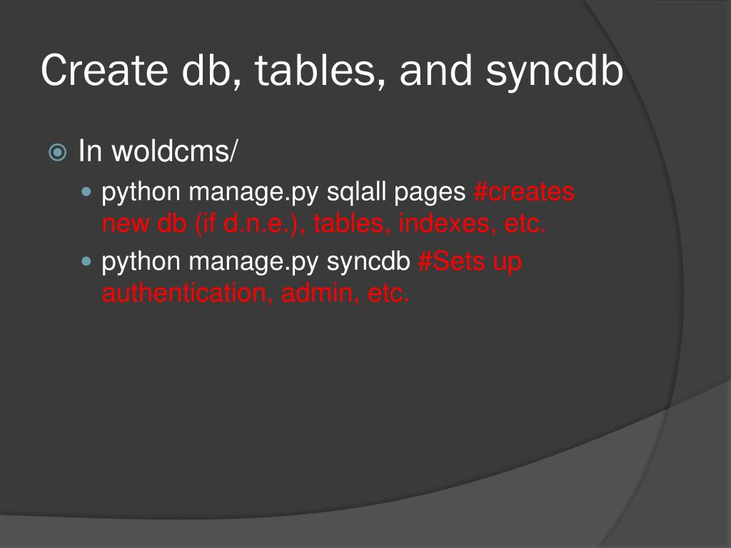 Create db, tables, and syncdb • In woldcms/ • python manage.py sqlall pages #creates new db (if d.n.e.), tables, indexes, etc. • python manage.py syncdb#Sets up authentication, admin, etc.