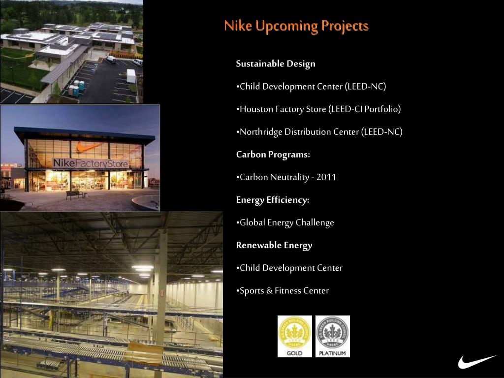 Nike Upcoming Projects • Sustainable Design • Child Development Center (LEED-NC) • Houston Factory Store (LEED-CI Portfolio) • Northridge Distribution Center (LEED-NC) • Carbon Programs: • Carbon Neutrality - 2011 • Energy Efficiency: • Global Energy Challenge • Renewable Energy • Child Development Center • Sports & Fitness Center