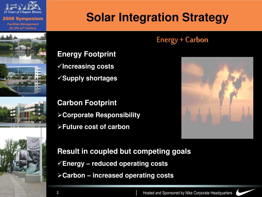 Nike, Inc. Climate Neutrality. Energy + Carbon. Energy Footprint Increasing costs Supply shortages Carbon Footprint Corporate Responsibility Future cost of carbon Result in coupled but competing goals Energy – reduced operating costs Carbon – increased operating costs. Energy + Carbon.