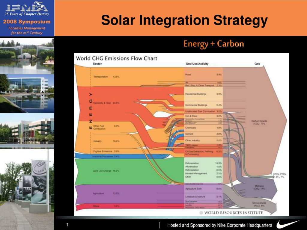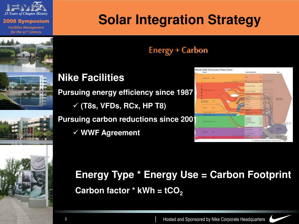 Energy + Carbon • Nike Facilities • Pursuing energy efficiency since 1987 • (T8s, VFDs, RCx, HP T8) • Pursuing carbon reductions since 2001 • WWF Agreement Energy Type * Energy Use = Carbon Footprint Carbon factor * kWh = tCO2