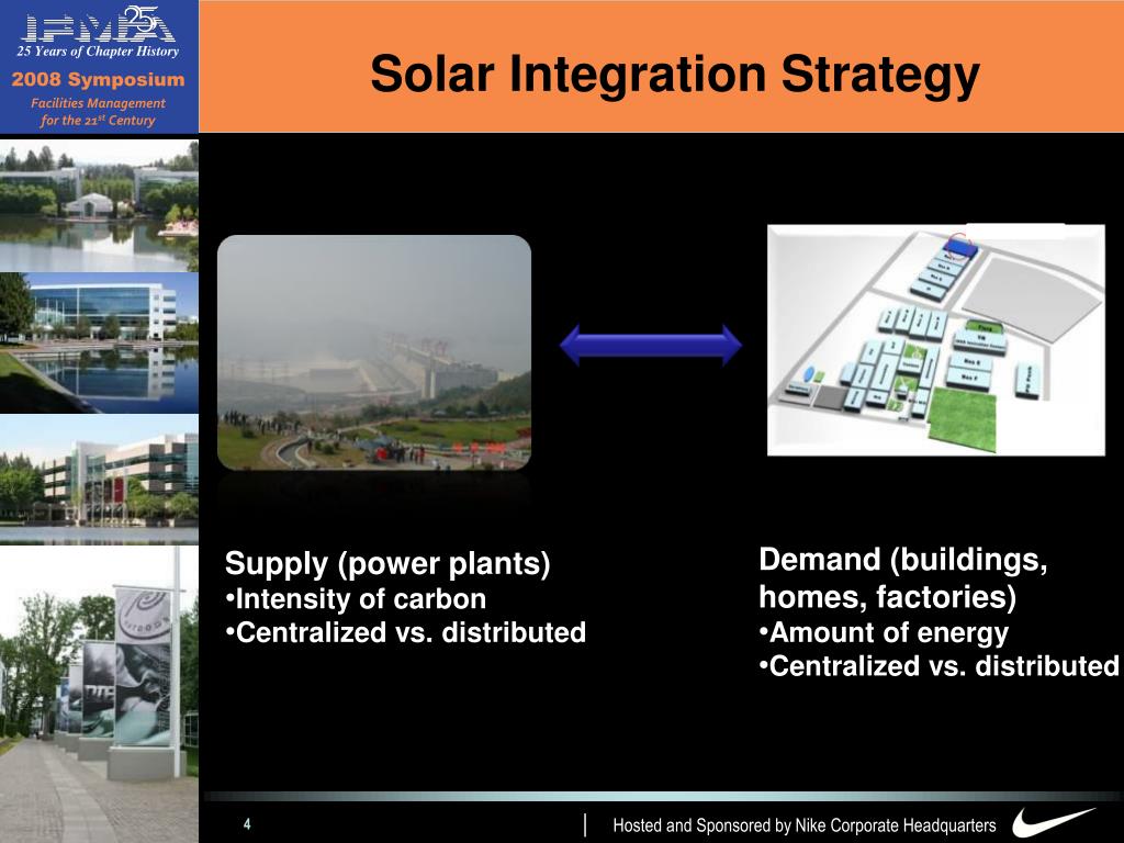 Nike – Sustainable Portfolio Payback: Before incentives: 67 years After incentives: 6 years Produces 14% of electricity consumed by facility Part of a LEED-NC certification (submitting 58 points) Utilized local roofing contractor for turn-key solar installation