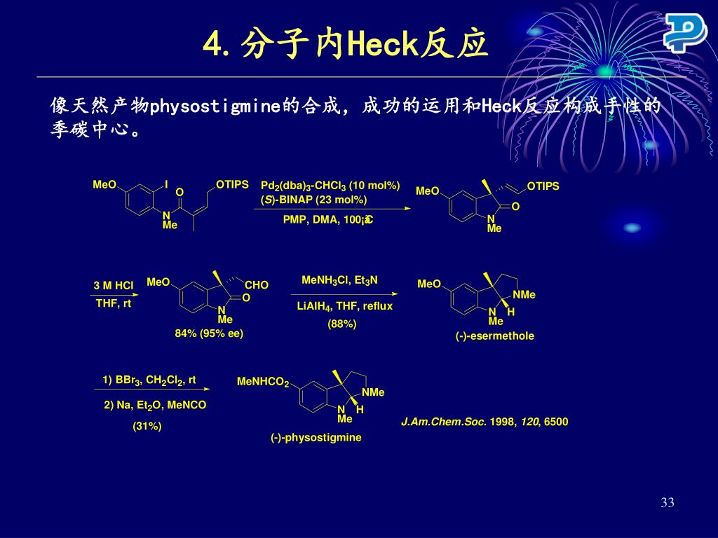 4.分子内Heck反应 像天然产物physostigmine的合成,成功的运用和Heck反应构成手性的季碳中心。