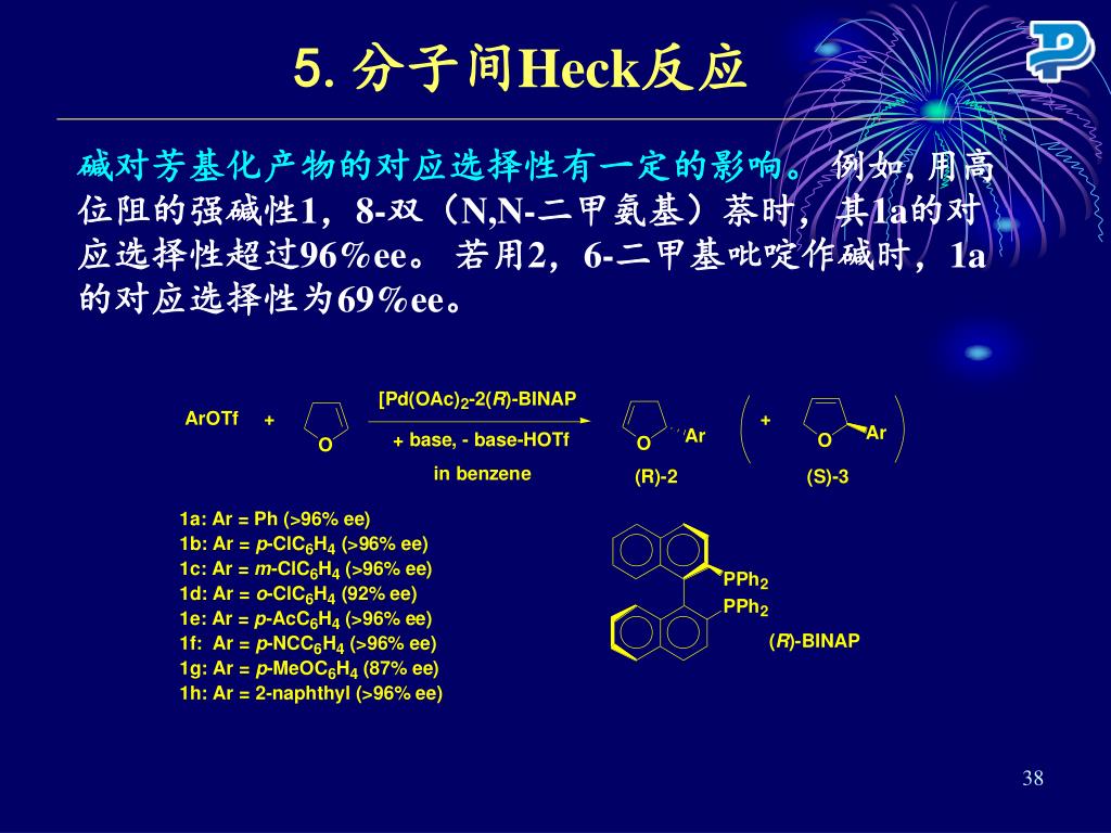5.分子间Heck反应 碱对芳基化产物的对应选择性有一定的影响。 例如, 用高位阻的强碱性1,8-双(N,N-二甲氨基)萘时,其1a的对应选择性超过96%ee。 若用2,6-二甲基吡啶作碱时,1a的对应选择性为69%ee。