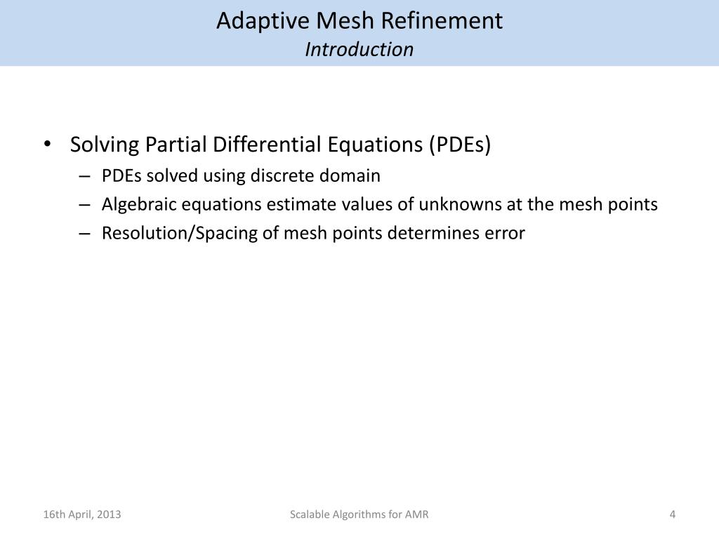 Adaptive Mesh RefinementIntroduction • Solving Partial Differential Equations (PDEs) • PDEs solved using discrete domain • Algebraic equations estimate values of unknowns at the mesh points • Resolution/Spacing of mesh points determines error Scalable Algorithms for AMR