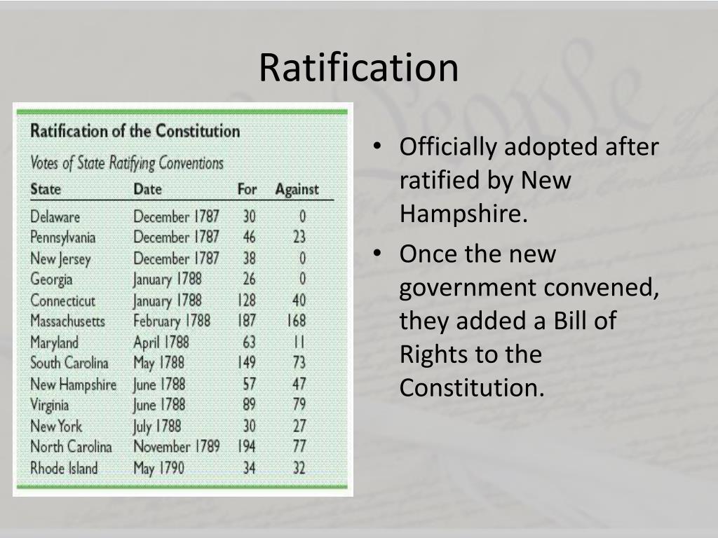 Ratification • Officially adopted after ratified by New Hampshire. • Once the new government convened, they added a Bill of Rights to the Constitution.