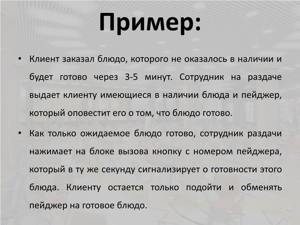 Пример: • Клиент заказал блюдо, которого не оказалось в наличии и будет готово через 3-5 минут. Сотрудник на раздаче выдает клиенту имеющиеся в наличии блюда и пейджер, который оповестит его о том, что блюдо готово. • Как только ожидаемое блюдо готово, сотрудник раздачи нажимает на блоке вызова кнопку с номером пейджера, который в ту же секунду сигнализирует о готовности этого блюда. Клиенту остается только подойти и обменять пейджер на готовое блюдо.