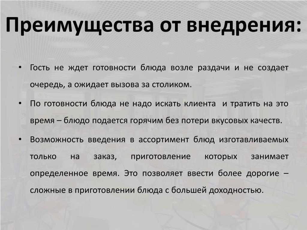Преимущества от внедрения: • Гость не ждет готовности блюда возле раздачи и не создает очередь, а ожидает вызова за столиком. • По готовности блюда не надо искать клиента и тратить на это время – блюдо подается горячим без потери вкусовых качеств. • Возможность введения в ассортимент блюд изготавливаемых только на заказ, приготовление которых занимает определенное время. Это позволяет ввести более дорогие – сложные в приготовлении блюда с большей доходностью.