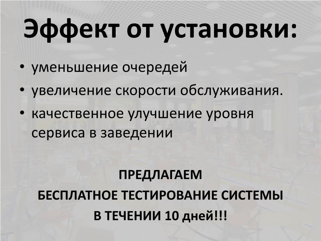 Эффект от установки: • уменьшение очередей • увеличение скорости обслуживания. • качественное улучшение уровня сервиса в заведении ПРЕДЛАГАЕМ БЕСПЛАТНОЕ ТЕСТИРОВАНИЕ СИСТЕМЫ В ТЕЧЕНИИ 10 дней!!!