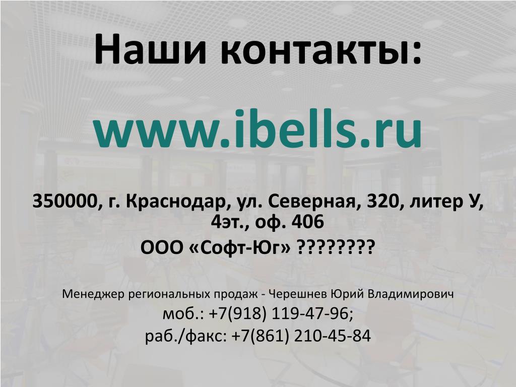 Наши контакты: www.ibells.ru 350000, г. Краснодар, ул. Северная, 320, литер У, 4эт., оф. 406 ООО «Софт-Юг» ???????? Менеджер региональных продаж - Черешнев Юрий Владимирович моб.: +7(918) 119-47-96; раб./факс: +7(861) 210-45-84
