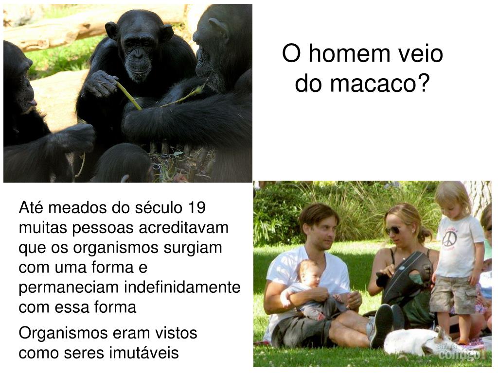 O homem veio do macaco? Até meados do século 19 muitas pessoas acreditavam que os organismos surgiam com uma forma e permaneciam indefinidamente com essa forma Organismos eram vistos como seres imutáveis