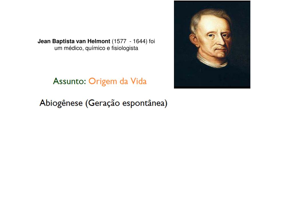 O homem veio do macaco?. Até meados do século 19 muitas pessoas acreditavam que os organismos surgiam com uma forma e permaneciam indefinidamente com essa forma. Organismos eram vistos como seres imutáveis. Jean Baptista van Helmont (1577 - 1644) foi um médico, químico e fisiologista.