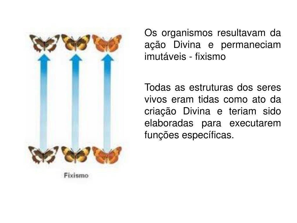 Os organismos resultavam da ação Divina e permaneciam imutáveis - fixismo Todas as estruturas dos seres vivos eram tidas como ato da criação Divina e teriam sido elaboradas para executarem funções específicas.