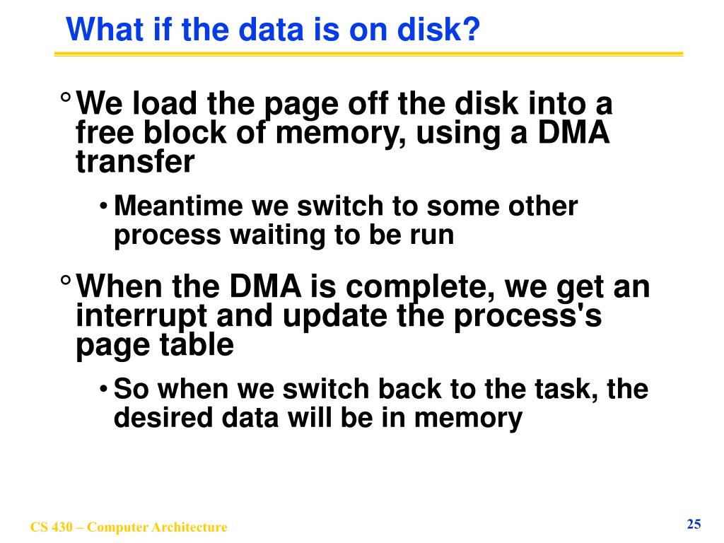 What if the data is on disk? • We load the page off the disk into a free block of memory, using a DMA transfer • Meantime we switch to some other process waiting to be run • When the DMA is complete, we get an interrupt and update the process's page table • So when we switch back to the task, the desired data will be in memory