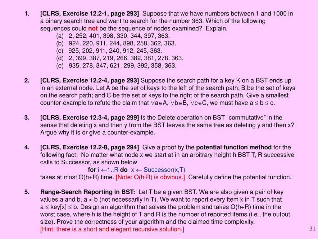 [CLRS, Exercise 12.2-1, page 293] Suppose that we have numbers between 1 and 1000 in a binary search tree and want to search for the number 363. Which of the following sequences could not be the sequence of nodes examined? Explain. (a) 2, 252, 401, 398, 330, 344, 397, 363. (b) 924, 220, 911, 244, 898, 258, 362, 363. (c) 925, 202, 911, 240, 912, 245, 363. (d) 2, 399, 387, 219, 266, 382, 381, 278, 363. (e) 935, 278, 347, 621, 299, 392, 358, 363. [CLRS, Exercise 12.2-4, page 293] Suppose the search path for a key K on a BST ends up in an external node. Let A be the set of keys to the left of the search path; B be the set of keys on the search path; and C be the set of keys to the right of the search path. Give a smallest counter-example to refute the claim that aA, bB, cC, we must have a b c. [CLRS, Exercise 12.3-4, page 299] Is the Delete operation on BST “commutative” in the sense that deleting x and then y from the BST leaves the same tree as deleting y and then x? Argue why it is or give a counter-example. [CLRS, Exercise 12.2-8, page 294]Give a proof by the potential function method for the following fact: No matter what node x we start at in an arbitrary height h BST T, R successive calls to Successor, as shown below for i 1..R do x Successor(x,T) takes at most O(h+R) time. [Note: O(hR) is obvious.] Carefully define the potential function. Range-Search Reporting in BST: Let T be a given BST. We are also given a pair of key values a and b, a < b (not necessarily in T). We want to report every item x in T such that a key[x] b. Design an algorithm that solves the problem and takes O(h+R) time in the worst case, where h is the height of T and R is the number of reported items (i.e., the output size). Prove the correctness of your algorithm and the claimed time complexity. [Hint: there is a short and elegant recursive solution.]