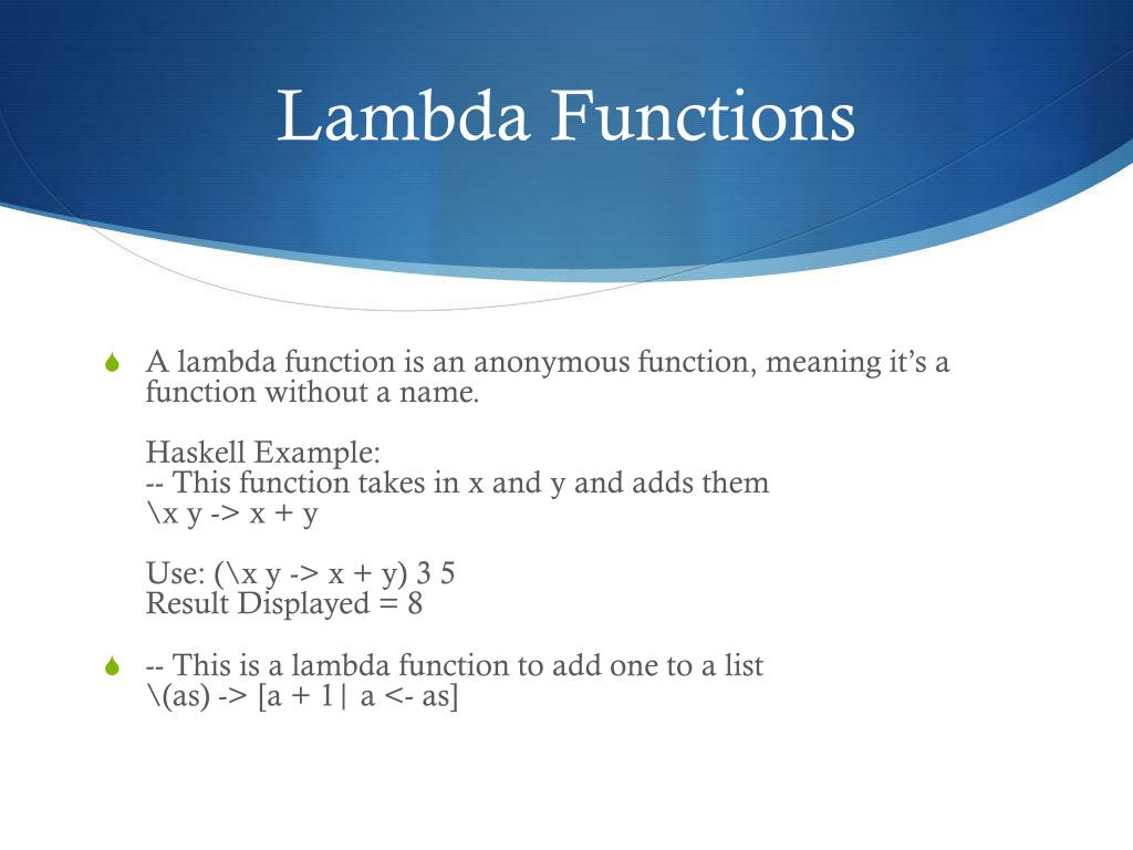Lambda Functions • A lambda function is an anonymous function, meaning it’s a function without a name. Haskell Example: -- This function takes in x and y and adds them\x y -> x + yUse: (\x y -> x + y) 3 5Result Displayed = 8 • -- This is a lambda function to add one to a list\(as) -> [a + 1| a <- as]