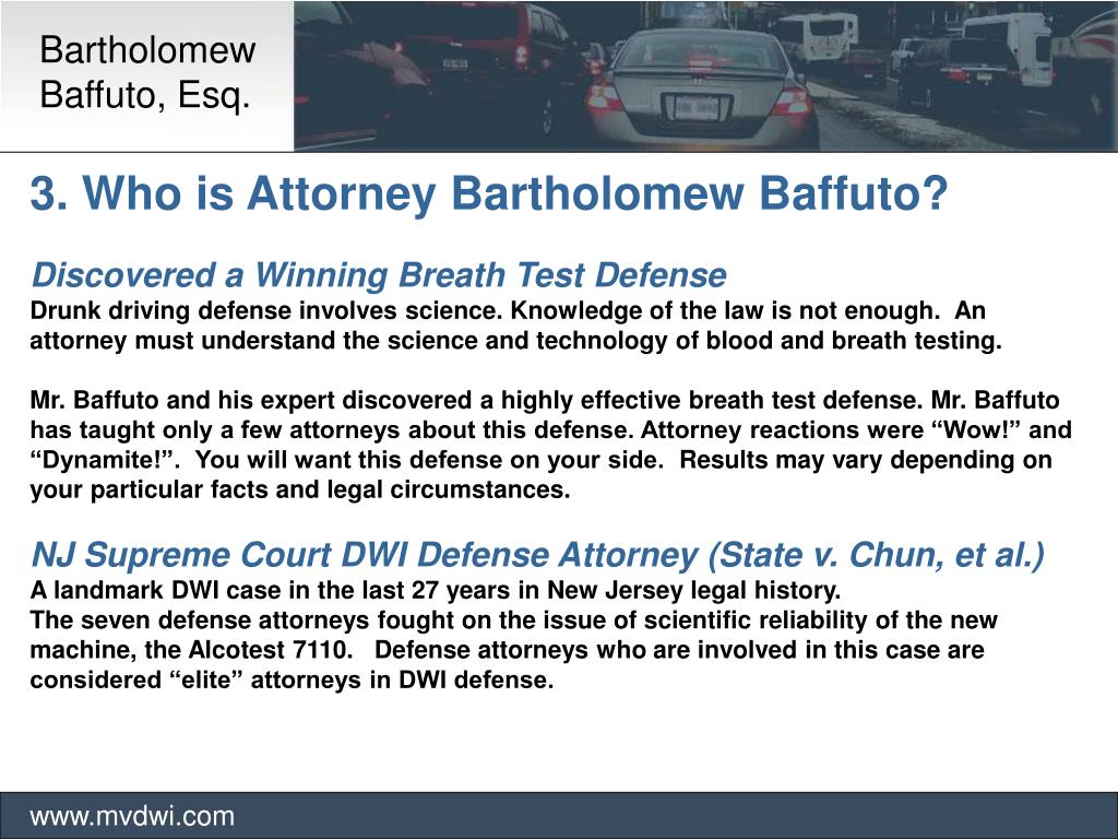Bartholomew Baffuto, Esq. www.mvdwi.com 3. Who is Attorney Bartholomew Baffuto? Discovered a Winning Breath Test Defense Drunk driving defense involves science. Knowledge of the law is not enough. An attorney must understand the science and technology of blood and breath testing. Mr. Baffuto and his expert discovered a highly effective breath test defense. Mr. Baffuto has taught only a few attorneys about this defense. Attorney reactions were “Wow!” and “Dynamite!”. You will want this defense on your side. Results may vary depending on your particular facts and legal circumstances. NJ Supreme Court DWI Defense Attorney (State v. Chun, et al.) A landmark DWI case in the last 27 years in New Jersey legal history. The seven defense attorneys fought on the issue of scientific reliability of the new machine, the Alcotest 7110. Defense attorneys who are involved in this case are considered “elite” attorneys in DWI defense.