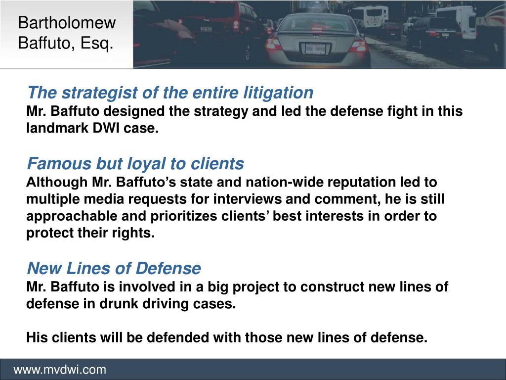 Bartholomew Baffuto, Esq. www.mvdwi.com The strategist of the entire litigation Mr. Baffuto designed the strategy and led the defense fight in this landmark DWI case. Famous but loyal to clients Although Mr. Baffuto’s state and nation-wide reputation led to multiple media requests for interviews and comment, he is still approachable and prioritizes clients’ best interests in order to protect their rights. New Lines of Defense Mr. Baffuto is involved in a big project to construct new lines of defense in drunk driving cases. His clients will be defended with those new lines of defense.