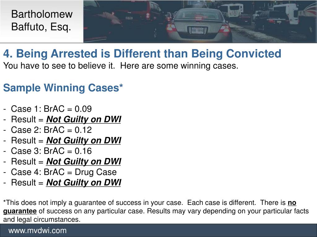 Bartholomew Baffuto, Esq. www.mvdwi.com • 4. Being Arrested is Different than Being Convicted • You have to see to believe it. Here are some winning cases. • Sample Winning Cases* • - Case 1: BrAC = 0.09 • - Result = Not Guilty on DWI • - Case 2: BrAC = 0.12 • - Result = Not Guilty on DWI • - Case 3: BrAC = 0.16 • - Result = Not Guilty on DWI • - Case 4: BrAC = Drug Case • Result = Not Guilty on DWI • *This does not imply a guarantee of success in your case. Each case is different. There is no guarantee of success on any particular case. Results may vary depending on your particular facts and legal circumstances.