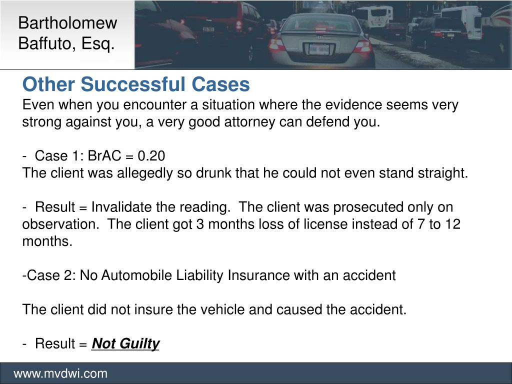 Bartholomew Baffuto, Esq. www.mvdwi.com • Other Successful Cases • Even when you encounter a situation where the evidence seems very strong against you, a very good attorney can defend you. • - Case 1: BrAC = 0.20 • The client was allegedly so drunk that he could not even stand straight. • - Result = Invalidate the reading. The client was prosecuted only on observation. The client got 3 months loss of license instead of 7 to 12 months. • Case 2: No Automobile Liability Insurance with an accident • The client did not insure the vehicle and caused the accident. • - Result = Not Guilty