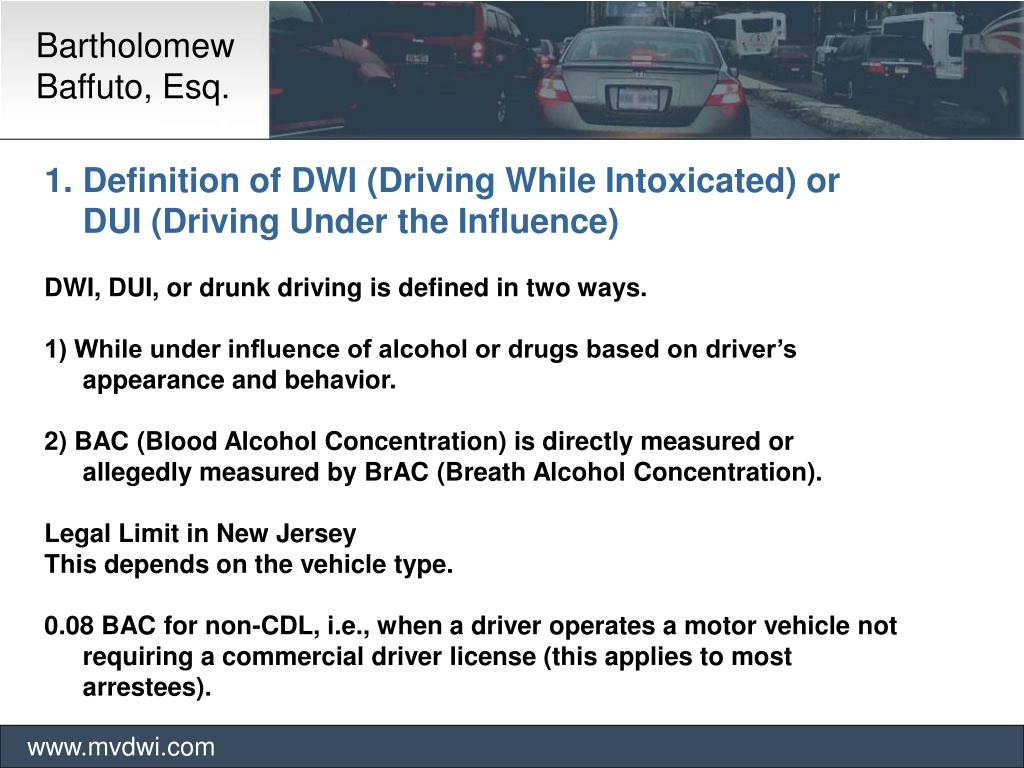 Bartholomew Baffuto, Esq. www.mvdwi.com • Definition of DWI (Driving While Intoxicated) or DUI (Driving Under the Influence) • DWI, DUI, or drunk driving is defined in two ways. • 1) While under influence of alcohol or drugs based on driver’s appearance and behavior. • 2) BAC (Blood Alcohol Concentration) is directly measured or allegedly measured by BrAC (Breath Alcohol Concentration). • Legal Limit in New Jersey • This depends on the vehicle type. • 0.08 BAC for non-CDL, i.e., when a driver operates a motor vehicle not requiring a commercial driver license (this applies to most arrestees).