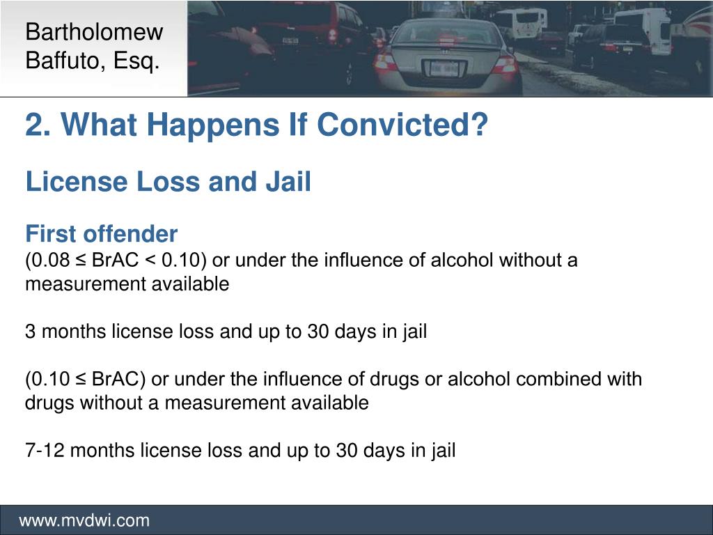 Bartholomew Baffuto, Esq. www.mvdwi.com 2. What Happens If Convicted? License Loss and Jail First offender (0.08 ≤ BrAC < 0.10) or under the influence of alcohol without a measurement available 3 months license loss and up to 30 days in jail (0.10 ≤ BrAC) or under the influence of drugs or alcohol combined with drugs without a measurement available 7-12 months license loss and up to 30 days in jail