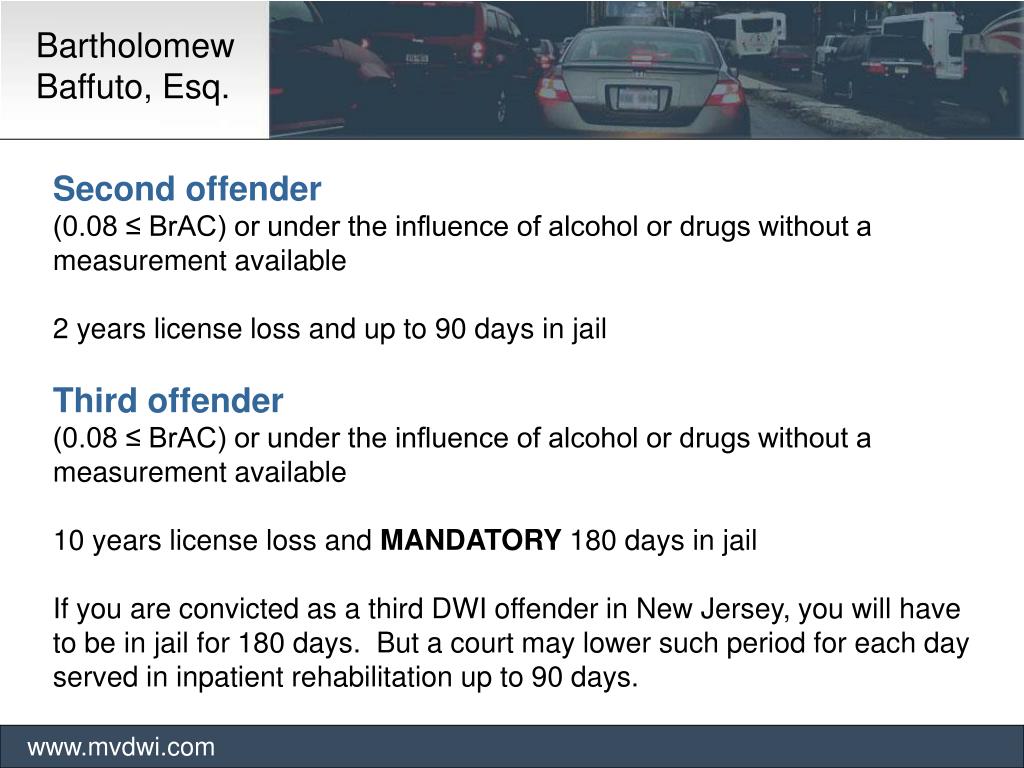 Bartholomew Baffuto, Esq. www.mvdwi.com Second offender (0.08 ≤ BrAC) or under the influence of alcohol or drugs without a measurement available 2 years license loss and up to 90 days in jail Third offender (0.08 ≤ BrAC) or under the influence of alcohol or drugs without a measurement available 10 years license loss and MANDATORY 180 days in jail If you are convicted as a third DWI offender in New Jersey, you will have to be in jail for 180 days. But a court may lower such period for each day served in inpatient rehabilitation up to 90 days.