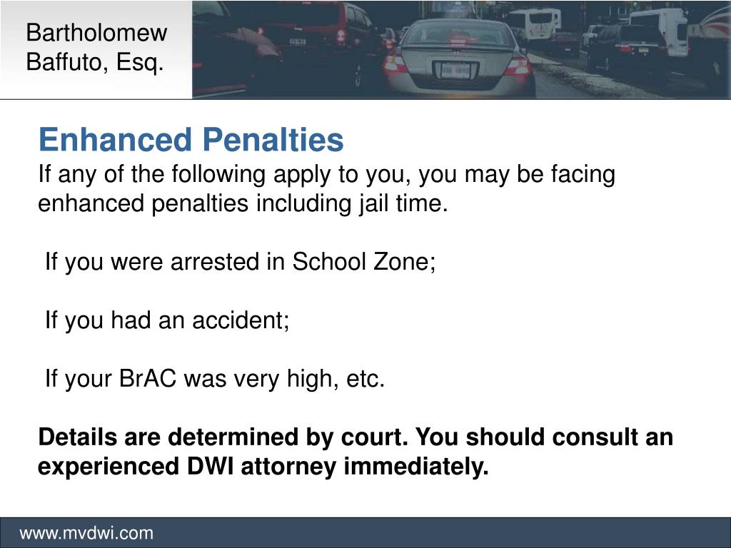 Bartholomew Baffuto, Esq. www.mvdwi.com Enhanced Penalties If any of the following apply to you, you may be facing enhanced penalties including jail time. If you were arrested in School Zone; If you had an accident; If your BrAC was very high, etc. Details are determined by court. You should consult an experienced DWI attorney immediately.