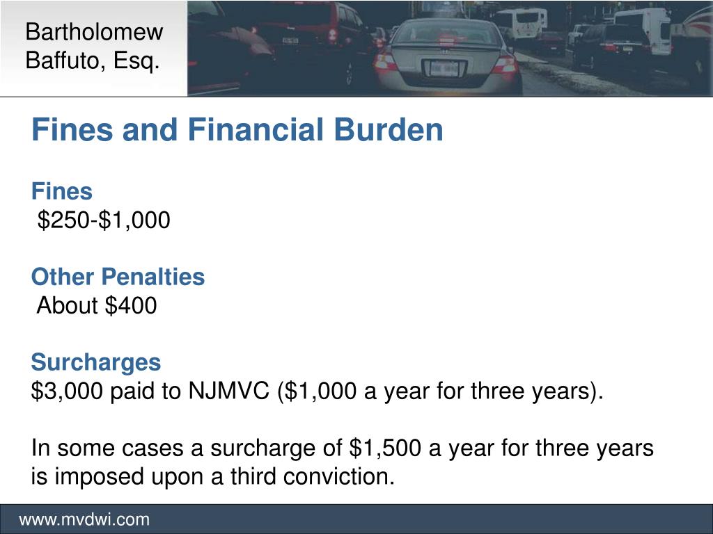 Bartholomew Baffuto, Esq. www.mvdwi.com Fines and Financial Burden Fines $250-$1,000 Other Penalties About $400 Surcharges $3,000 paid to NJMVC ($1,000 a year for three years). In some cases a surcharge of $1,500 a year for three years is imposed upon a third conviction.