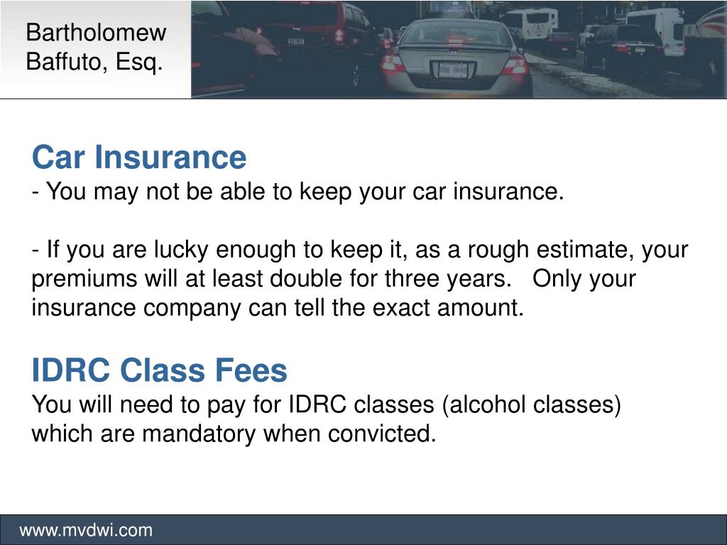 Bartholomew Baffuto, Esq. www.mvdwi.com Car Insurance - You may not be able to keep your car insurance. - If you are lucky enough to keep it, as a rough estimate, your premiums will at least double for three years. Only your insurance company can tell the exact amount. IDRC Class Fees You will need to pay for IDRC classes (alcohol classes) which are mandatory when convicted.