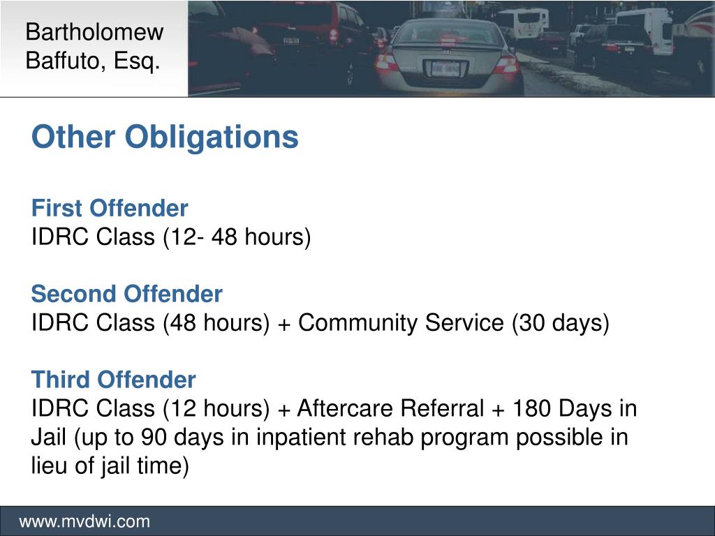 Bartholomew Baffuto, Esq. www.mvdwi.com Other Obligations First Offender IDRC Class (12- 48 hours) Second Offender IDRC Class (48 hours) + Community Service (30 days) Third Offender IDRC Class (12 hours) + Aftercare Referral + 180 Days in Jail (up to 90 days in inpatient rehab program possible in lieu of jail time)