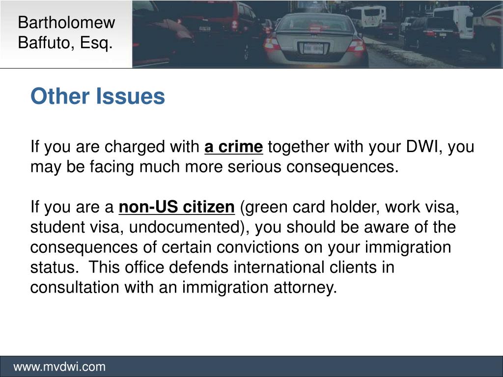 Bartholomew Baffuto, Esq. www.mvdwi.com Other Issues If you are charged with a crime together with your DWI, you may be facing much more serious consequences. If you are a non-US citizen (green card holder, work visa, student visa, undocumented), you should be aware of the consequences of certain convictions on your immigration status. This office defends international clients in consultation with an immigration attorney.