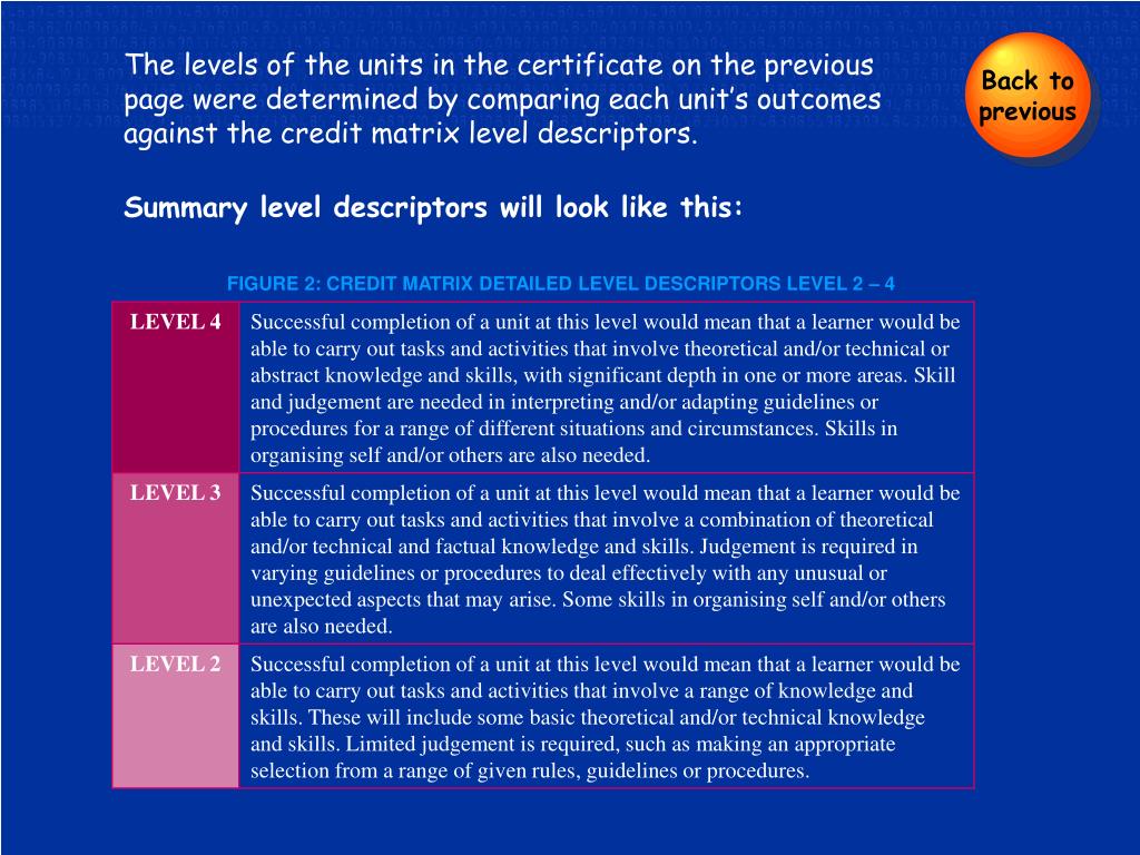The levels of the units in the certificate on the previous page were determined by comparing each unit’s outcomes against the credit matrix level descriptors. Summary level descriptors will look like this: Back to previous FIGURE 2: CREDIT MATRIX DETAILED LEVEL DESCRIPTORS LEVEL 2 – 4