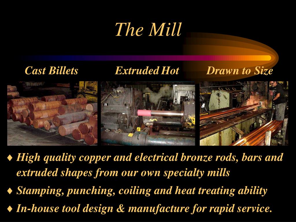 The Mill High quality copper and electrical bronze rods, bars and extruded shapes from our own specialty mills Stamping, punching, coiling and heat treating ability In-house tool design & manufacture for rapid service. Cast Billets ExtrudedHot Drawn to Size