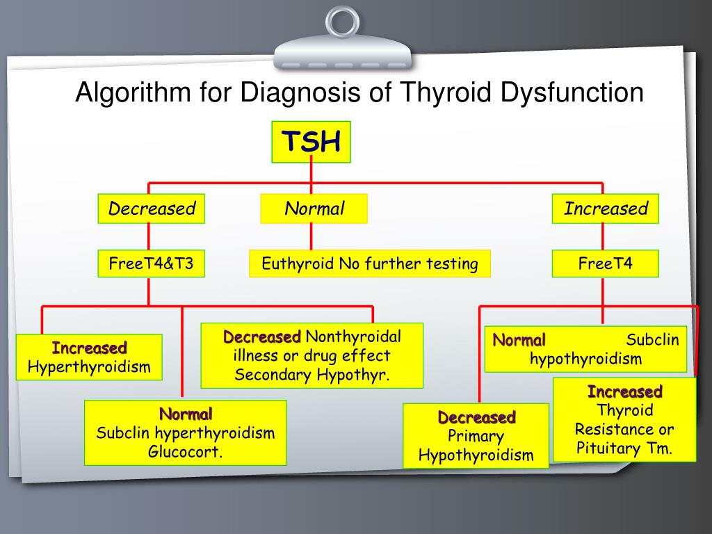 Algorithm for Diagnosis of Thyroid Dysfunction TSH Decreased Normal Increased FreeT4&T3 Euthyroid No further testing FreeT4 DecreasedNonthyroidal illness or drug effect Secondary Hypothyr. Normal Subclin hypothyroidism IncreasedHyperthyroidism Increased Thyroid Resistance or Pituitary Tm. Normal Subclin hyperthyroidism Glucocort. Decreased Primary Hypothyroidism